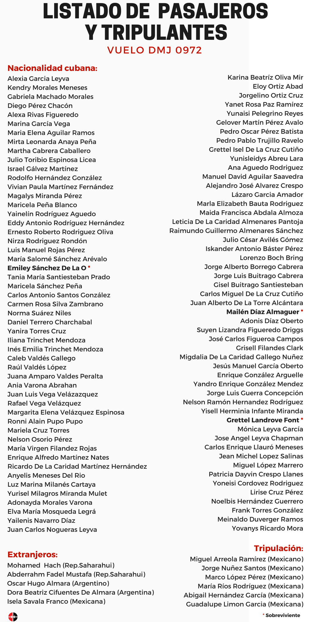 110 people died after a Boeing 737-201 Adv plane (XA-UHZ) crashed near Cuba's main airport in Havana, the country's worst air disaster in decades. Three women were pulled alive from the wreckage, but are said to be in a critical condition. Cuban state media say a 23-year-old survivor Gretell Landrove Font of Friday’s plane crash in Havana has died on May 21, 2018, a 40-year-old surviver Emiley Sanchez De la O has died on May 25, 2018 raising the death toll to 112. The only survivor of the plane crash is Mailen Díaz Almaguer. The aircraft, built in 1979, was carrying 107 passengers and six crew members. Cuban authorities have launched an investigation, and two days of national mourning have been declared. The Boeing 737-201,