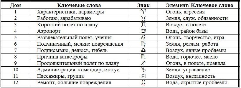 Таблица с ключевыми словами домов и знаков в астрокарте: